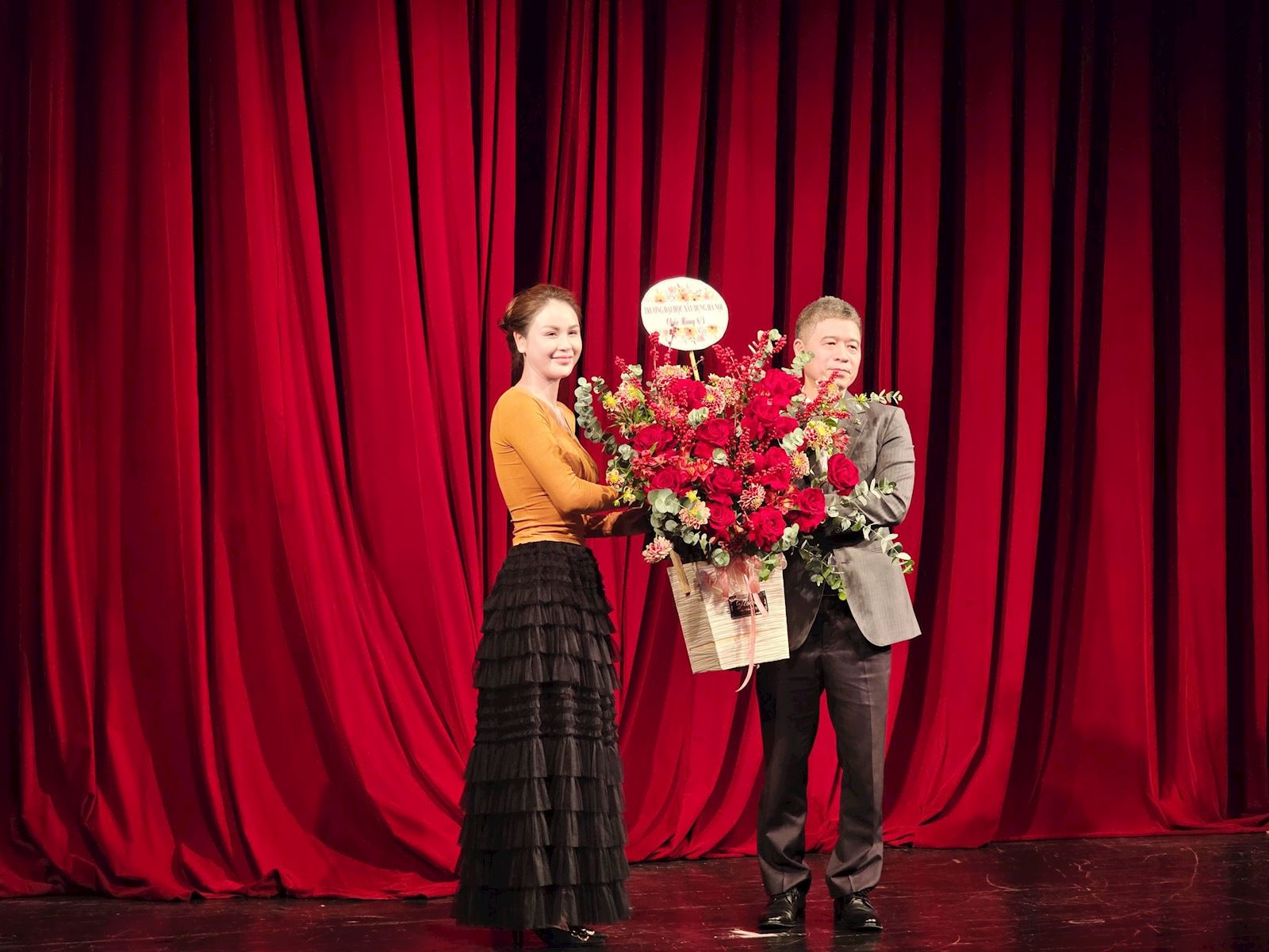 Thầy hiệu trưởng tặng hoa chị em phụ nữ của Nhà hát tuổi trẻ, đại diện nghệ sĩ Thu Quỳnh đón nhận