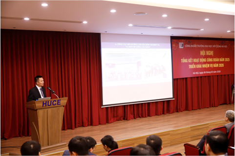 Thay mặt BCH CĐ trường, đ/c Hà Mạnh Hùng - Chủ tịch Công đoàn trường đã Khai mạc Hội nghị, đồng thời trình bày Tóm tắt Báo cáo tổng kết hoạt động Công đoàn Trường ĐHXD HN Năm 2025 và Phương hướng, nhiệm vụ năm 2026. Trong năm 2025 vừa qua, công tác CĐ của Nhà trường đã đạt được nhiều kết quả đáng trân trọng, với nhiều đổi mới trong phương pháp và nội dung, chủ động phối hợp với Nhà trường trong mọi hoạt động, xây dựng được tổ chức đoàn kết vững mạnh.