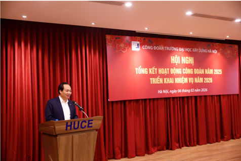 Thực hiện kế hoạch hoạt động năm học 2025 – 2026, được sự nhất trí của Đảng uỷ, sự quan tâm tạo điều kiện của Ban giám hiệu, sáng ngày 06/02/2026, BCH Công đoàn trường Đại học Xây dựng Hà Nội (ĐHXD HN) tổ chức hội nghị tổng kết công tác Công đoàn năm 2025 nhằm đánh giá kết quả đã đạt được trên các mặt công tác cũng như chỉ ra những tồn tại, hạn chế và giải pháp khắc phục; từ đó xây dựng phương hướng nhiệm vụ công tác năm 2026.